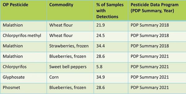 The table below provides some OP pesticide residue data for wheat flour, and some vegetables and fruits, that we obtained from the USDA Pesticide Data Program website (7).