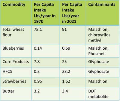 In 1970 the average per capita intake of wheat flour was 78.1 pounds per year. By 2021, the average per capita intake had reached 91 pounds per year (12). With nearly 25% of wheat samples showing OP pesticide residues of at least one and possibly two different pesticides, there is a significant exposure risk for OP pesticides in wheat. In the case of corn products, in 1970, the per capita intake each year was only 7.8 pounds (12). By 2021, the average American was eating 25 pounds per year of corn products and 23.2 pounds per year of high fructose corn syrup (HFCS is derived from corn starch). The OP pesticide residues found in both of these corn commodities is glyphosate. Eating conventionally grown corn products, including corn sweeteners such as HFCS results in a significant toxicity risk. Although in the previous chart 28.6 % of blueberry samples contained residues of one to two OP pesticide compounds, the average American eats less than one pound of blueberries each year. Blueberries are a low toxicity risk compared to wheat and corn products.